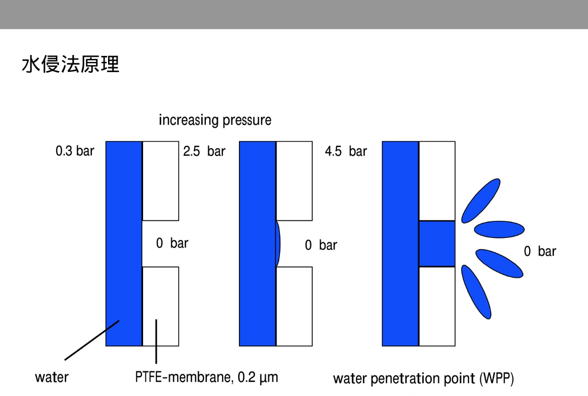 WIT是以水為介質(zhì)進行測試的,施加的壓力必須足以克服膜孔中的毛細管壓力才能使水自由流過疏水微孔膜的膜孔,這個起始臨界壓力叫作“水穿透點壓力(WPP)”,WPP由過濾膜的材質(zhì)和疏水性決定,與膜孔徑呈反比。